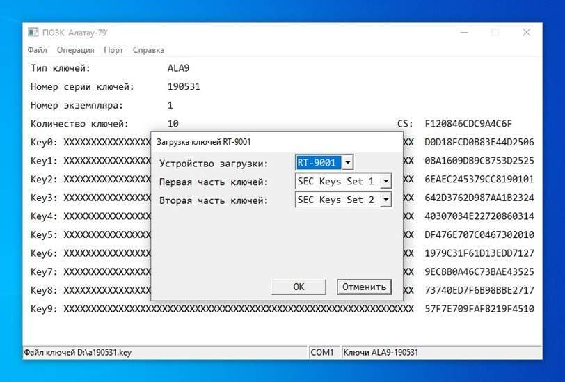 Программное обеспечение загрузки ключей “Алатау-79” предназначено для загрузки ключей в радиостанции CNR-9000 (приемопередатчик RT-9001), радиостанции CNR-710 (приемопередатчики RT-710G и RT-710МВМ) и другие средства криптографической защиты информации, совместимые с ними по ключевой системе.