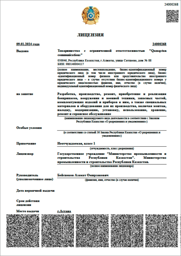 - «Разработка, производство, ремонт, приобретение и реализация боеприпасов, вооружения и военной техники, запасных частей, комплектующих изделий и приборов к ним, а также специальных материалов и оборудования для их производства, включая монтаж, наладку, модернизацию, установку, использование, хранение, ремонт и сервисное обслуживание» № 2400268 oт 09 января 2024 года;