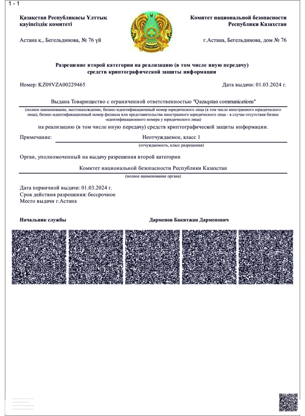 - «На реализацию (в том числе иную передачу) средств криптографической защиты информации» № KZ09VZA00229465 от 01 марта 2024 года.